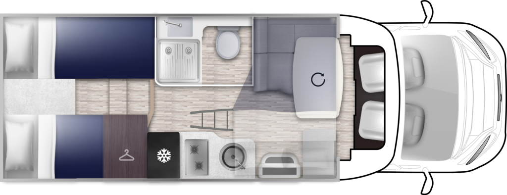 Zadní dvoulůžko: 201 x 79 + 201 x 79 / 199 x 130 cm